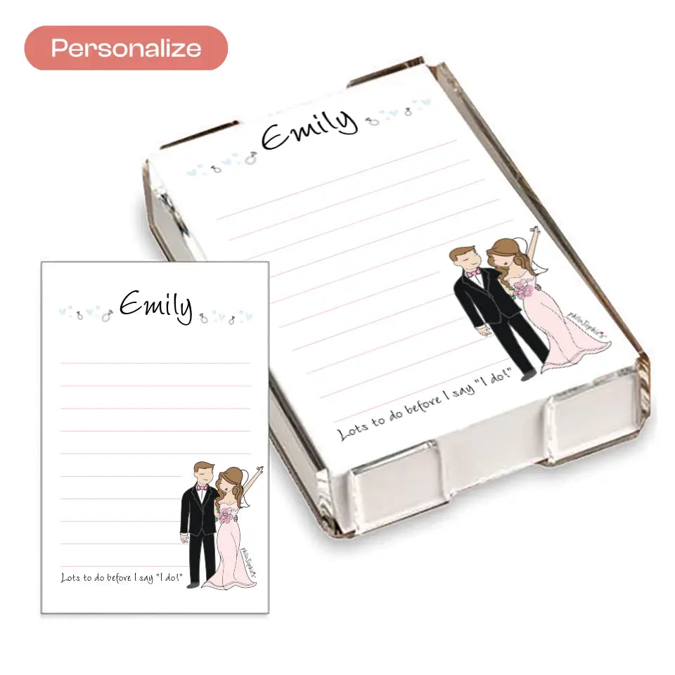 ~150 loose notesheets packaged in an acrylic box. 6.25" x 4.25" in size. Available in blank or lined note paper. Personalize with name, skin tone, hair style/color and more. Looking for something more customized? Contact us for custom quote.