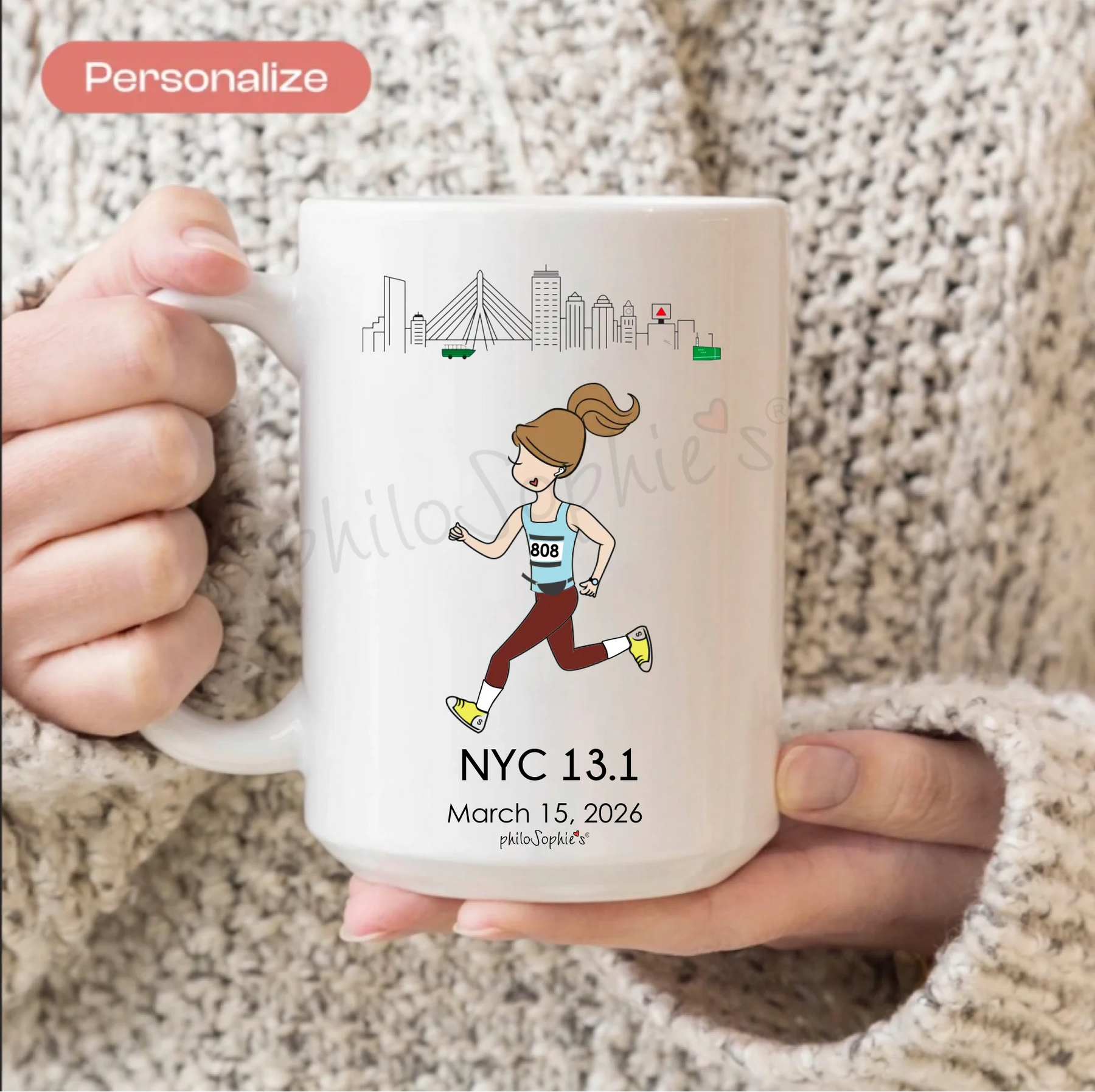 Personalized Ceramic Mug - City Skylines Female Runner, 5K, 10K, Half, Marathon - Personalize with your details