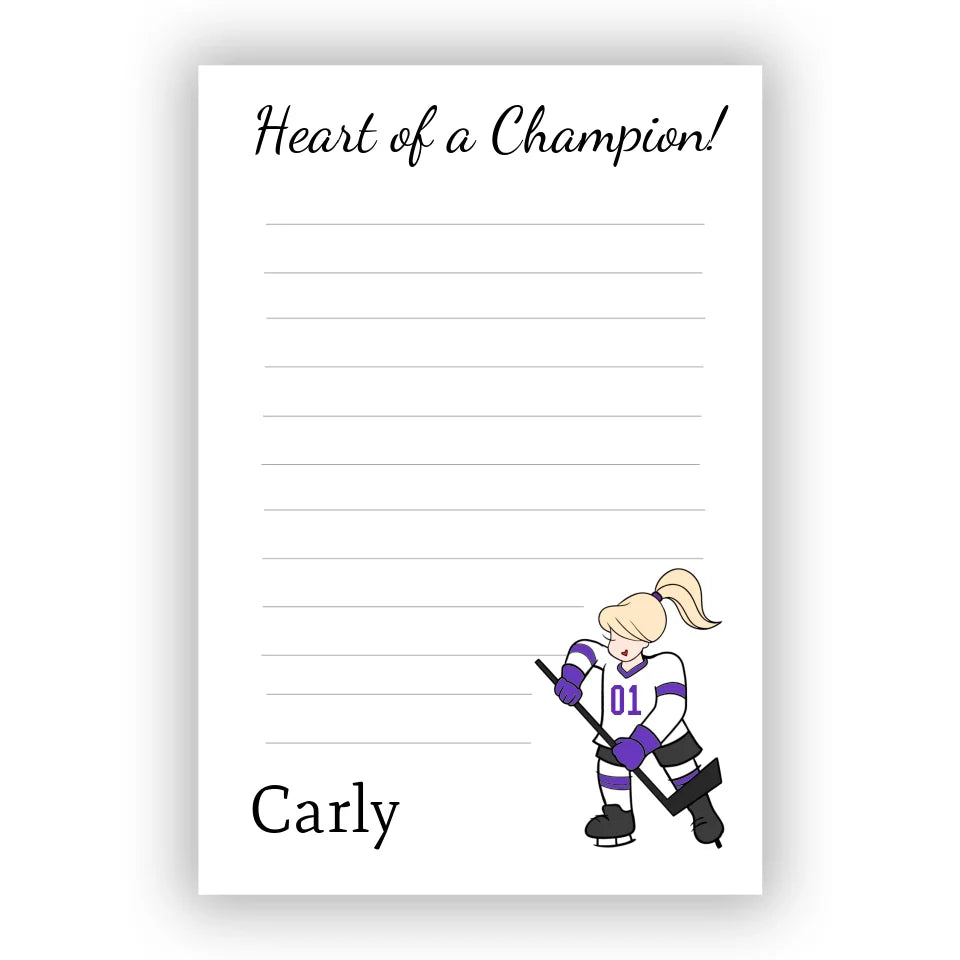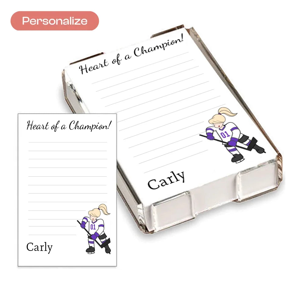 ~150 loose notesheets packaged in an acrylic box. 6.25" x 4.25" in size. Available in blank or lined note paper. Personalize with name, skin tone, hair style/color and more. Looking for something more customized? Contact us for custom quote.