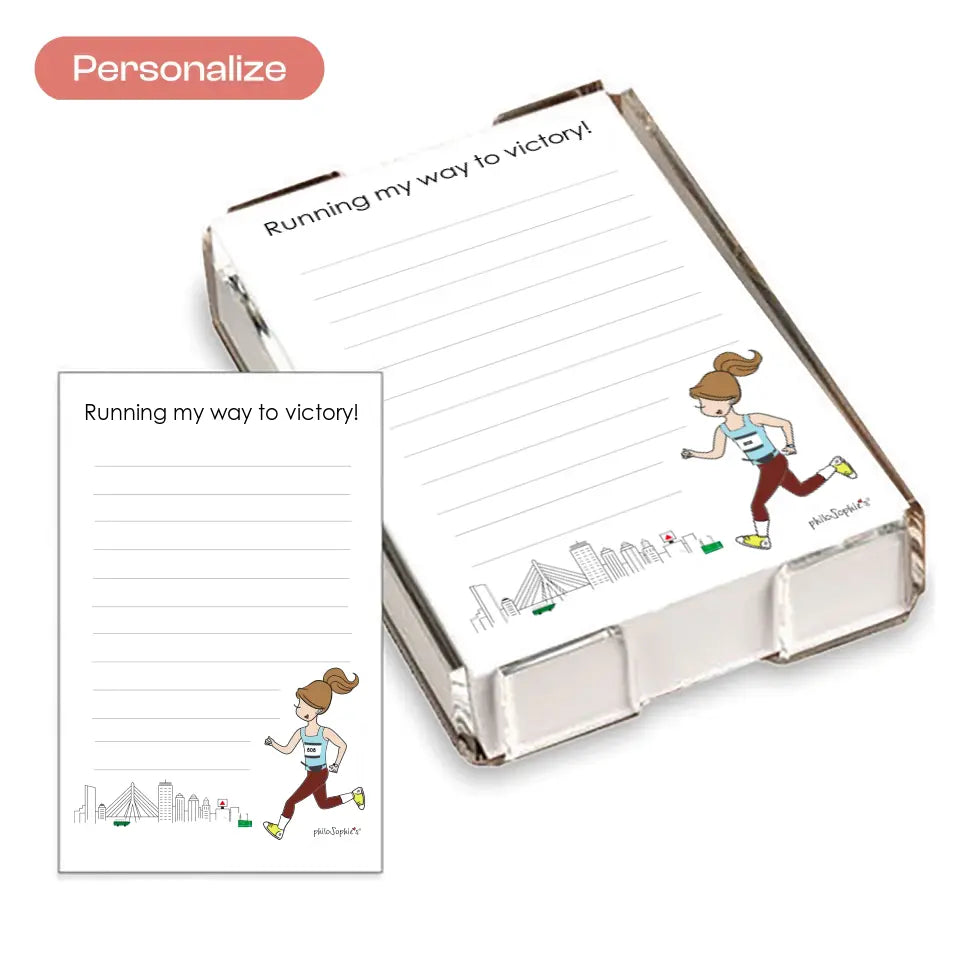 ~150 loose notesheets packaged in an acrylic box. 6.25" x 4.25" in size. Available in blank or lined note paper. Personalize with name, skin tone, hair style/color and more. Looking for something more customized? Contact us for custom quote.