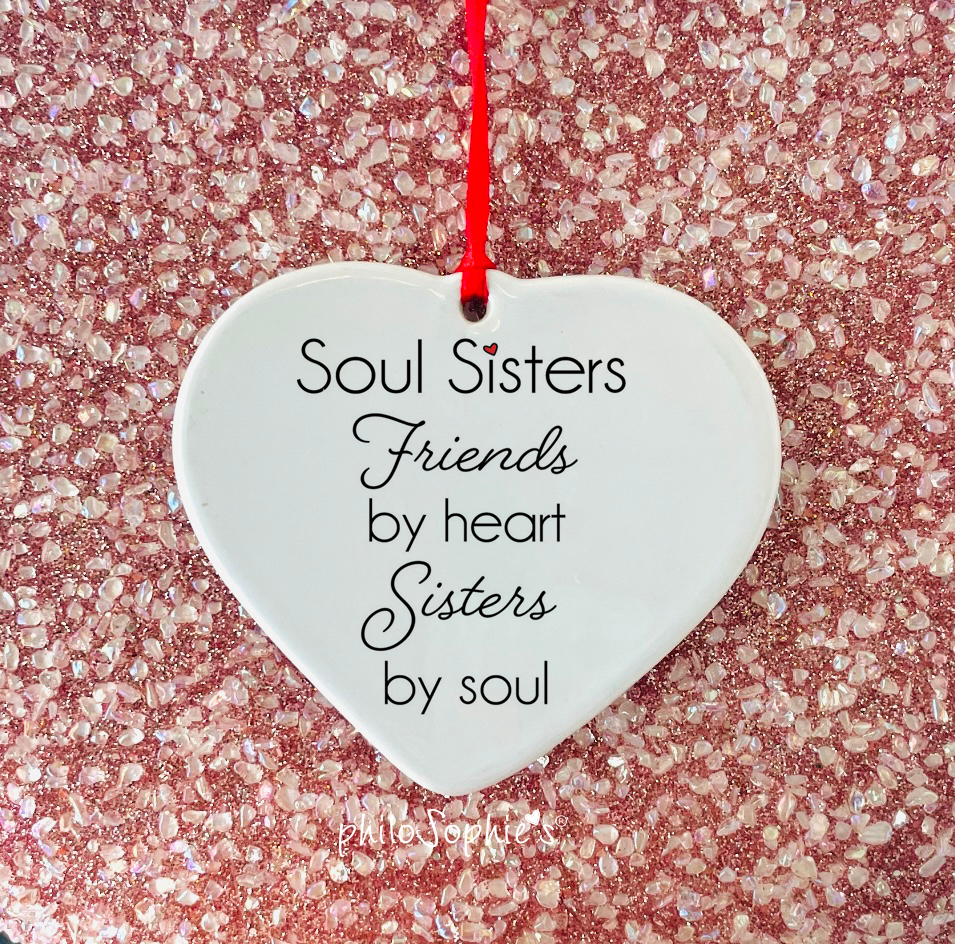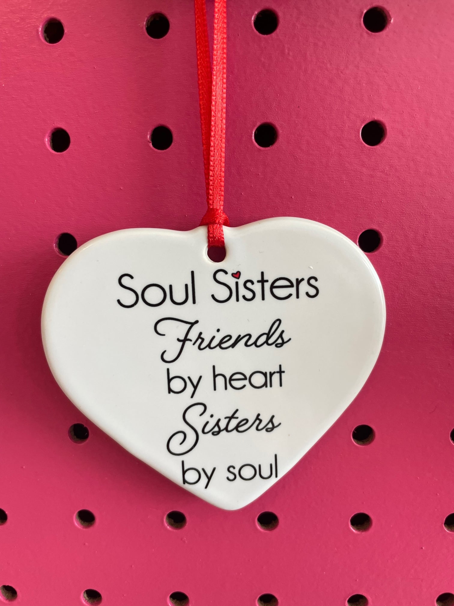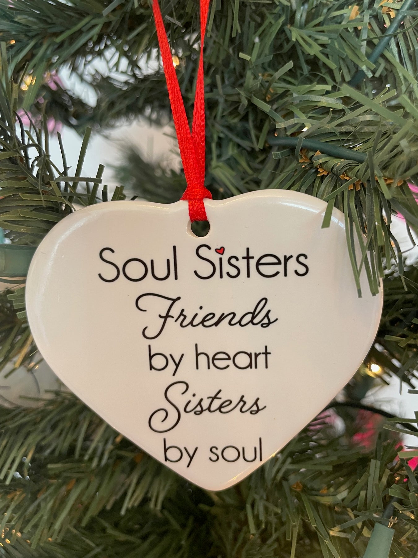 Soul Sisters - Friends by heart. Sisters by soul. 3 inch porcelain heart shaped ornament